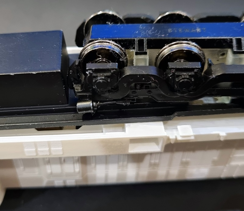 The kit was designed to fit onto a Bower HO C-628 or C630 chassis, as shown below, and a 3D printed kit to rotate the trucks was also made available.