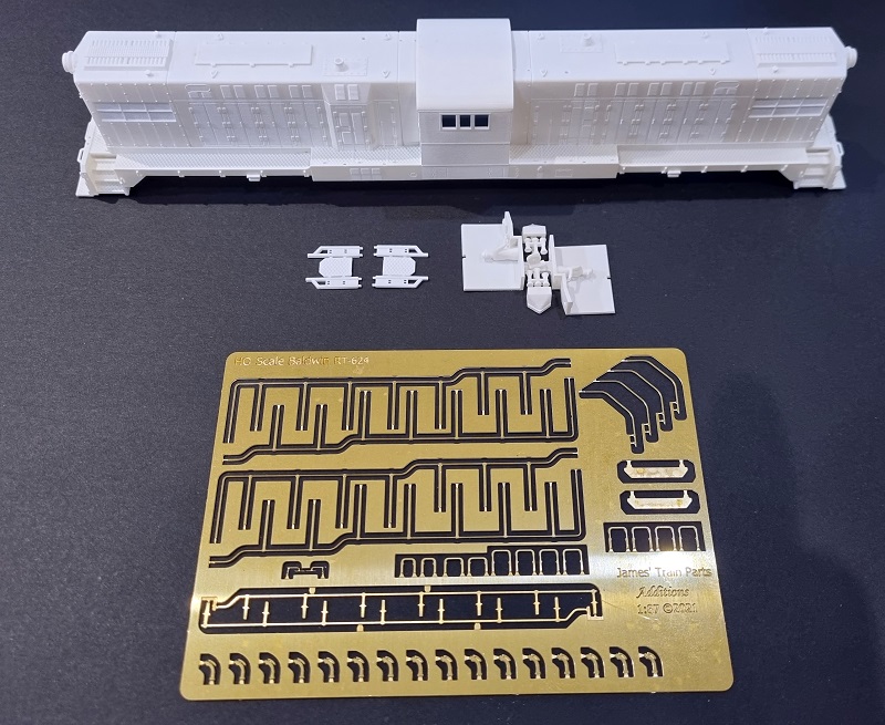 My 3D printed kit for a HO Baldwin RT-624 was released in August last year. The kit included the main body shell, 3D printed crew, and details, and also available was an etched brass fret with handrails, grab irons, and details to finish the shell.