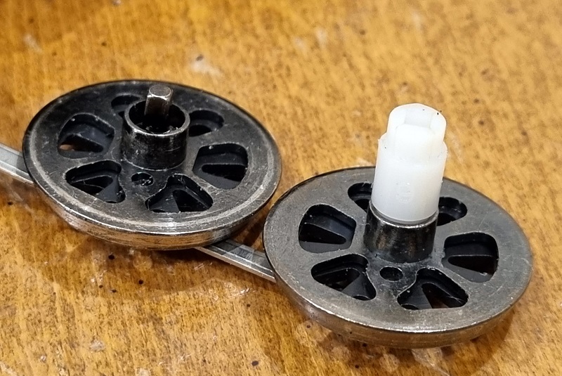 Each set contains one drive gear and three axles; below you can see an original axle and gear for comparison.