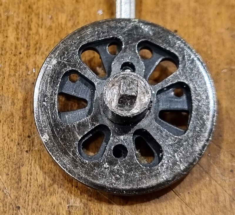 To see if all the glue has been removed one trick I discovered is to use one of the old axles, if you still have one intact that is, to test and see if it fits. It doesn’t matter if the old axle is cracking, as long as you can fit it into the wheel. Below you can see the axle fitted onto a wheel that wasn’t glued. There’s a small gap between the wheel and the step on the axle which is correct.