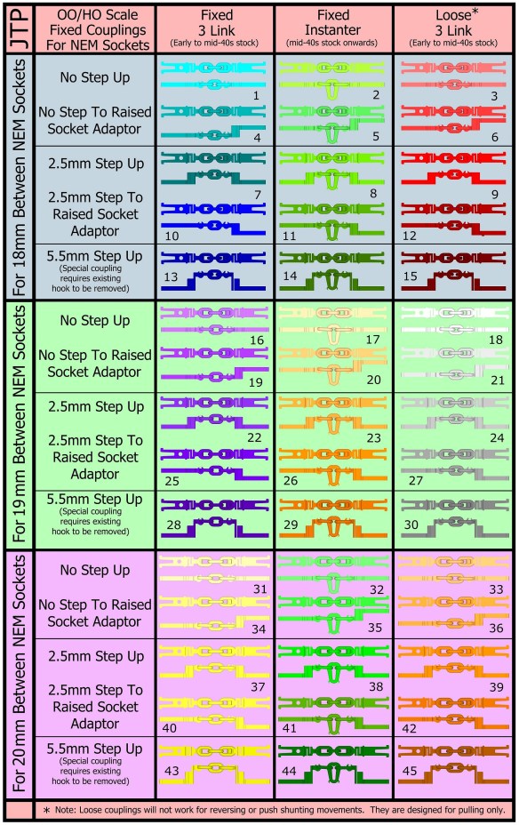 Containing one of each type: 1, 2, 3, 4, 5, 6, 7, 8, 9, 10, 11, 12, 13, 14 & 15. This set covers all the couplings in the short, 18mm, range including the special Big Step-Up couplings designed to raise the coupling to the correct height and the 3 Link Loose couplings. Please note both the Big Step-Up & 3 Link Loose couplings do not work as normal couplings; please see the individual type descriptions below.