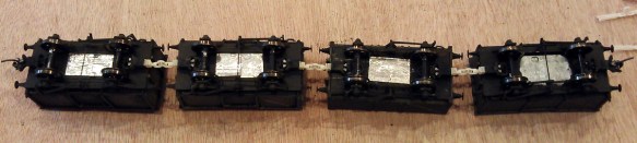 Below is an example of four coal wagons coupled with the Type 1 coupling. Sets of four are easy to pick up, when permanently linked. On each end is a Kadee knuckle coupling. Many sets have been assembled like this to form long coal trains.